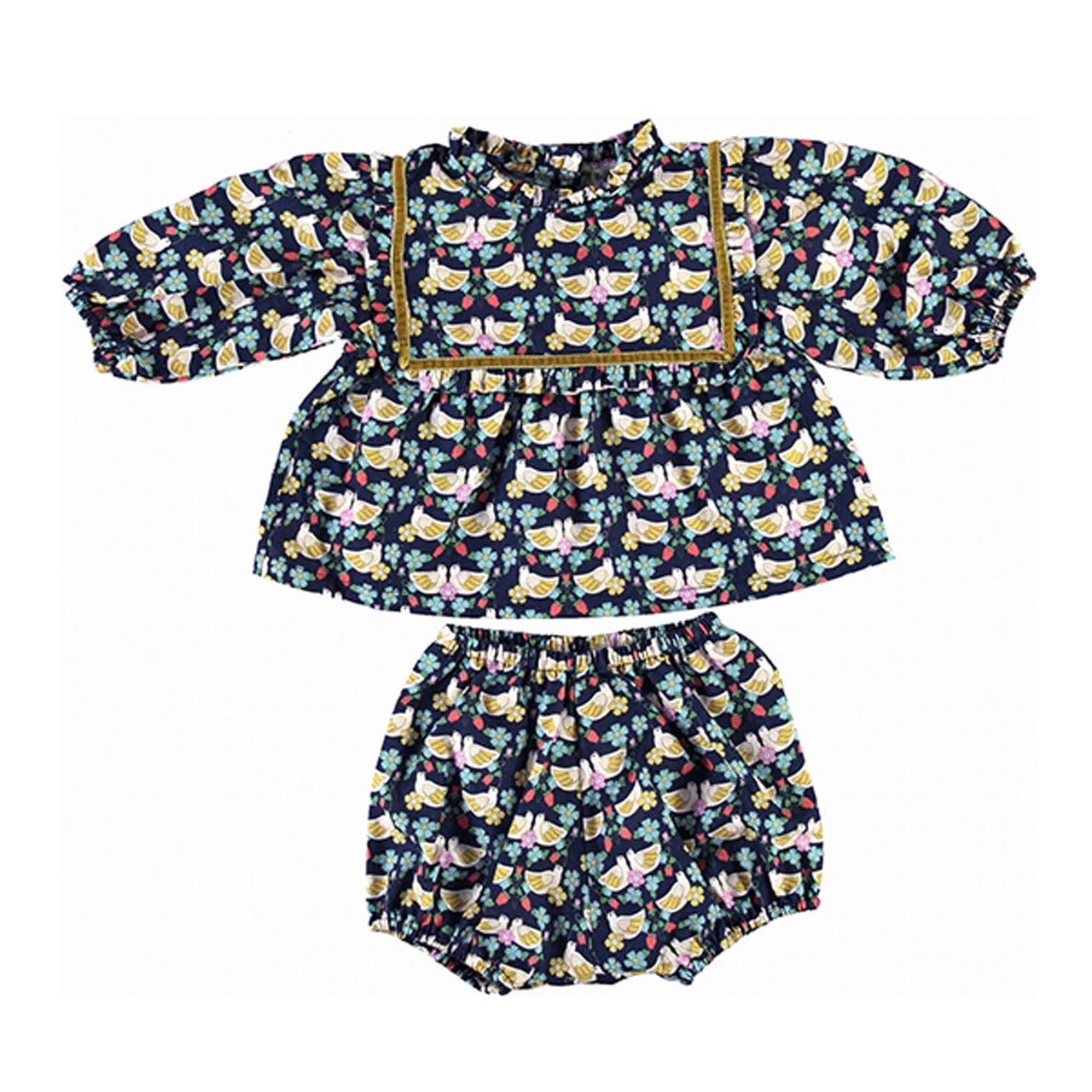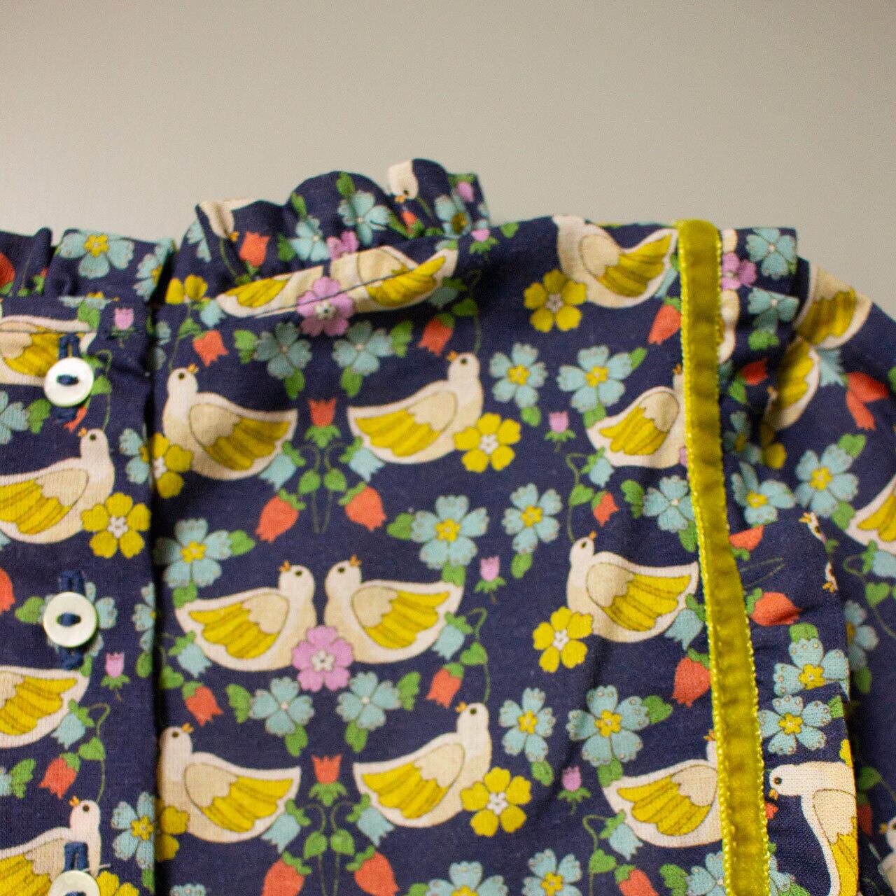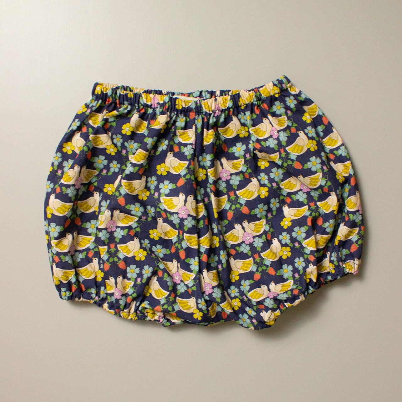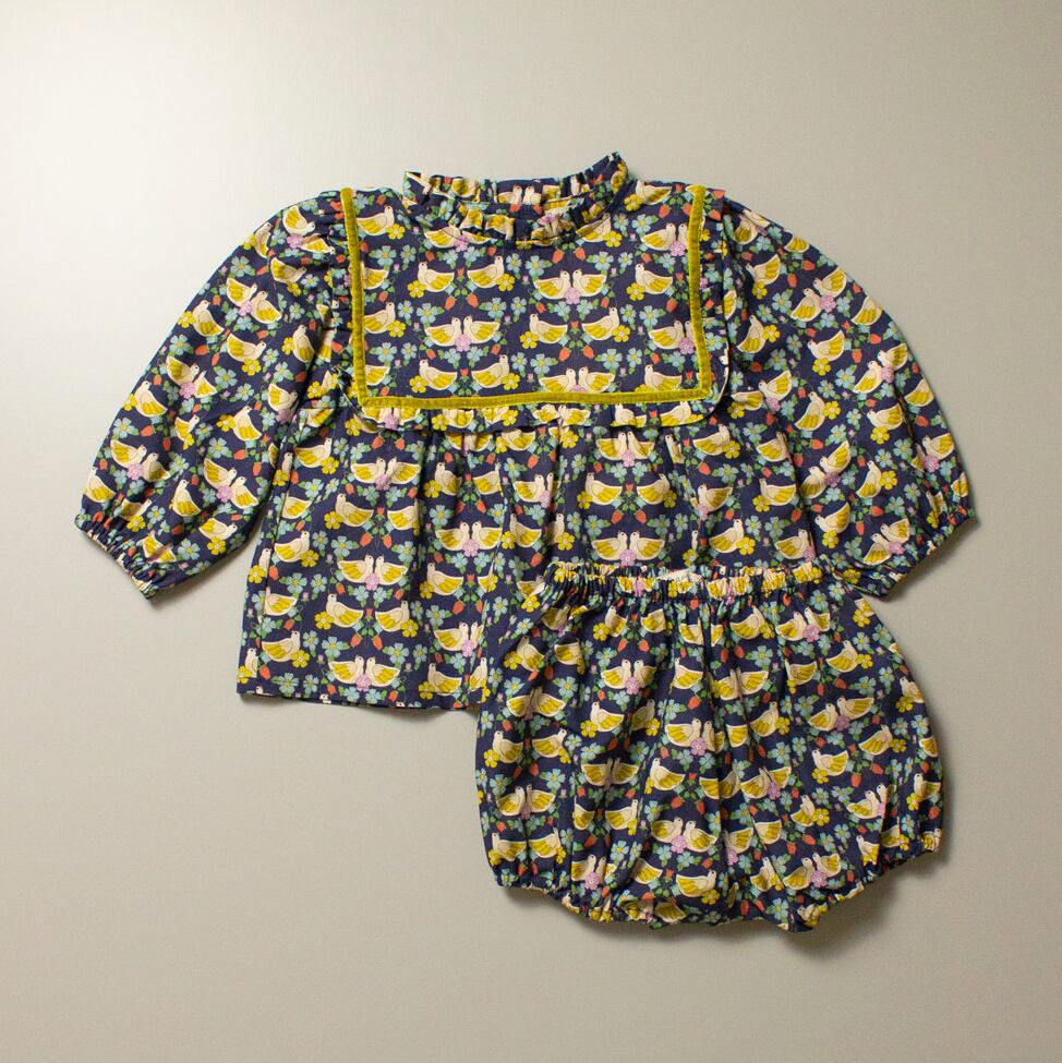 ノスタルジックな小鳥のプリントにベルベットリボンのトリミングが目を惹くブラウスとブルマーのセットです。