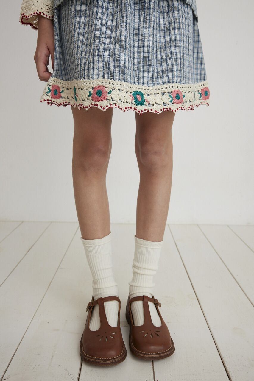 ブルーのチェック柄が可愛らしい緩やかなフレアスカート。とても柔らかなオーガニックコットン地の裾に施したクロシェと花がアクセントになっています。左脇にコンシールファスナーを施し、ウエストは調節可能なボタン付きゴムが通っています。お揃いのブラウスでお出かけ着にもおすすめです。