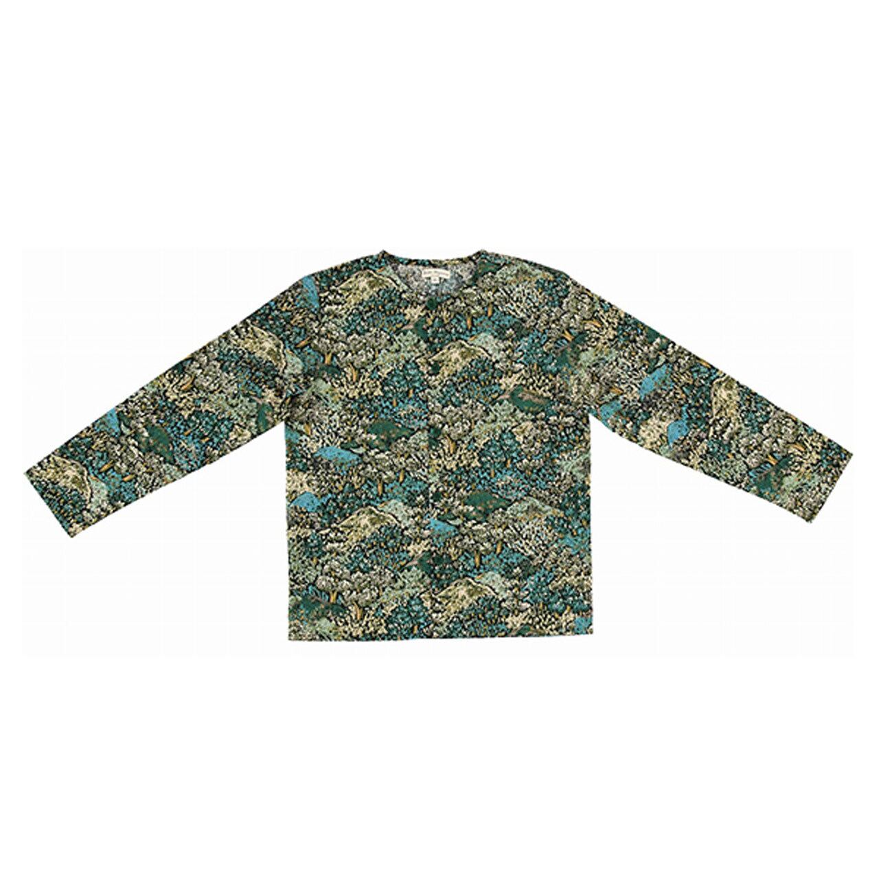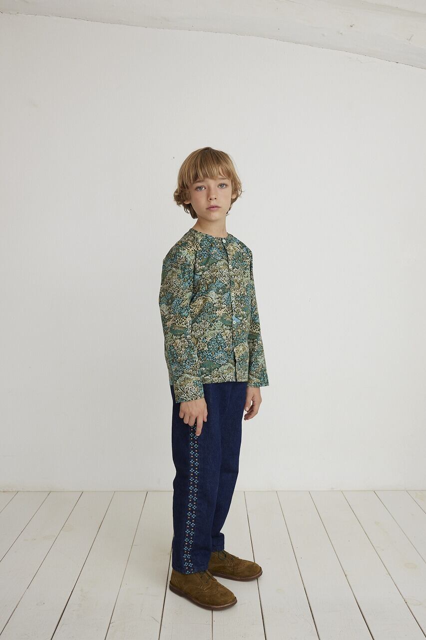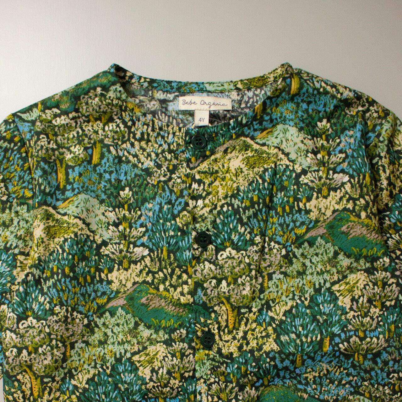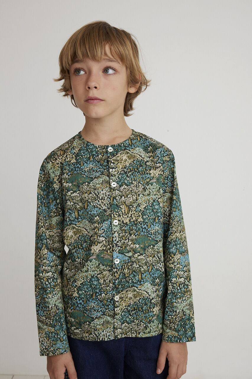 グリーン、ブルー、マスタードイエローのトーンで魔法の森をプリントしたリバティ社の長袖コットンシャツ。肌寒い時や外出時はカーディガンやパーカーを重ねて長いシーズンお楽しみいただけます。シャツが苦手なお子様にも着やすいノーカラーの前開きタイプで、とても柔らかく、薄手の生地を使用しています。半袖Tシャツの上に、フロントを開けて羽織りとしてもお使いいただけます。