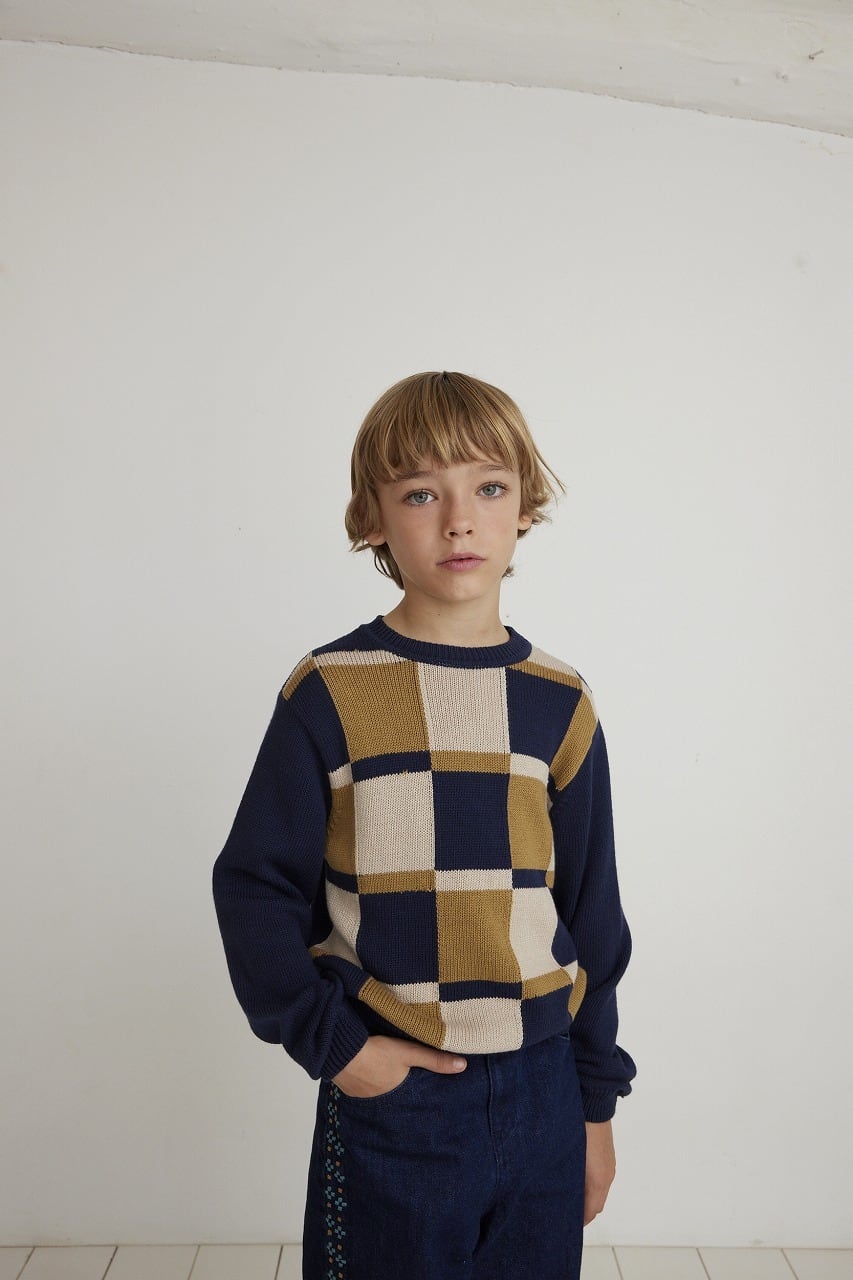 ネイビーブルーとキャラメルトーンの美しいカラーパレットが特徴のヴィンテージ風のSilasセーター。極上の柔らかさを誇るコットンウール混紡糸を使用し、セーターのチクチクが苦手なお子様にも着やすく編み上げられています。ノスタルジックなイメージで、タートルネックのカットソーとのレイヤードもおすすめです。