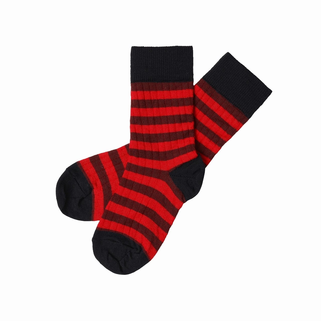 クラシックなリブ編みにコントラストカラーが目を惹くソックスは、コーディネートのアクセントにぴったりです。有害な化学物質を含んでいないウールで作られており、つま先とかかとは補強され、はき込み口はしっかりとした二重仕立てになっています。