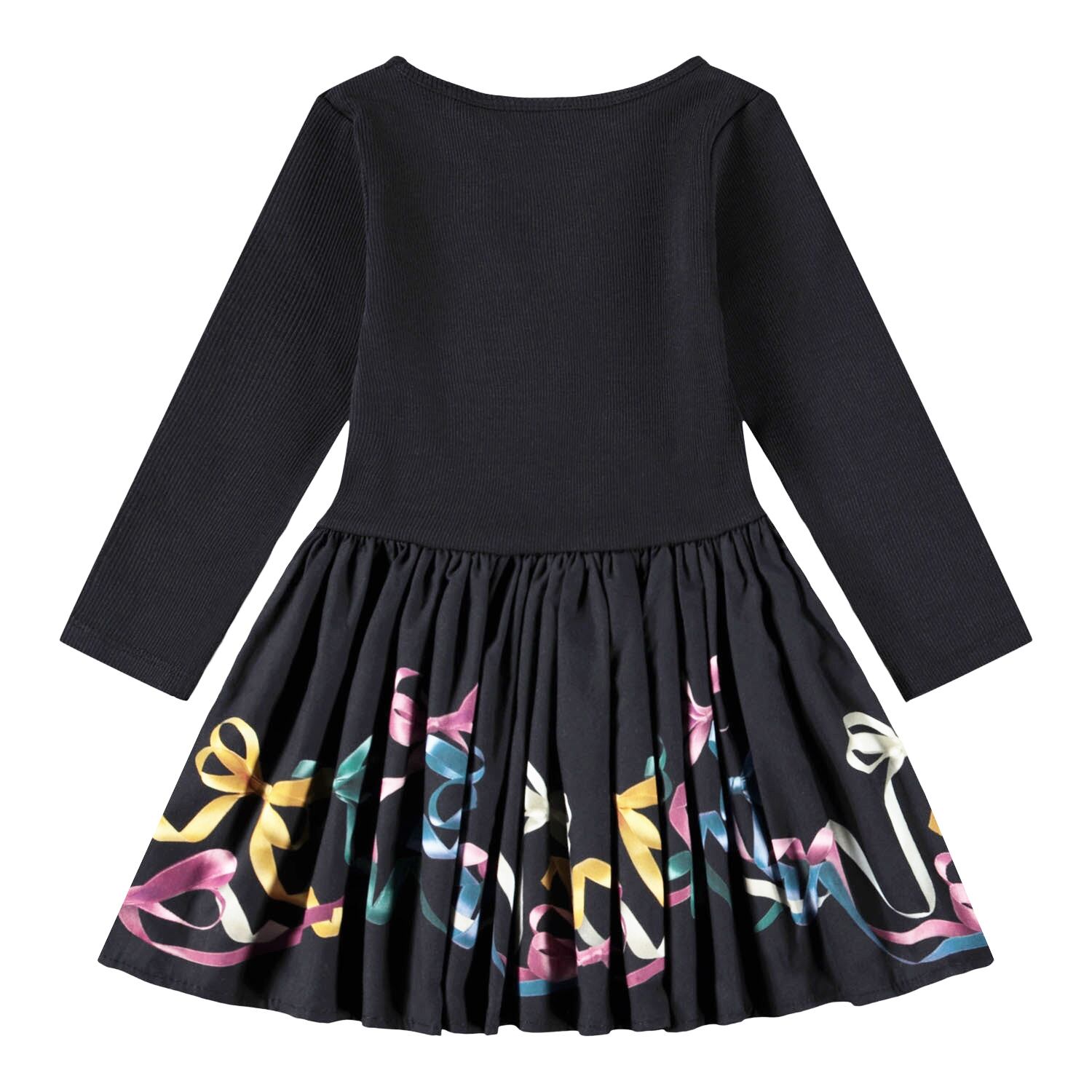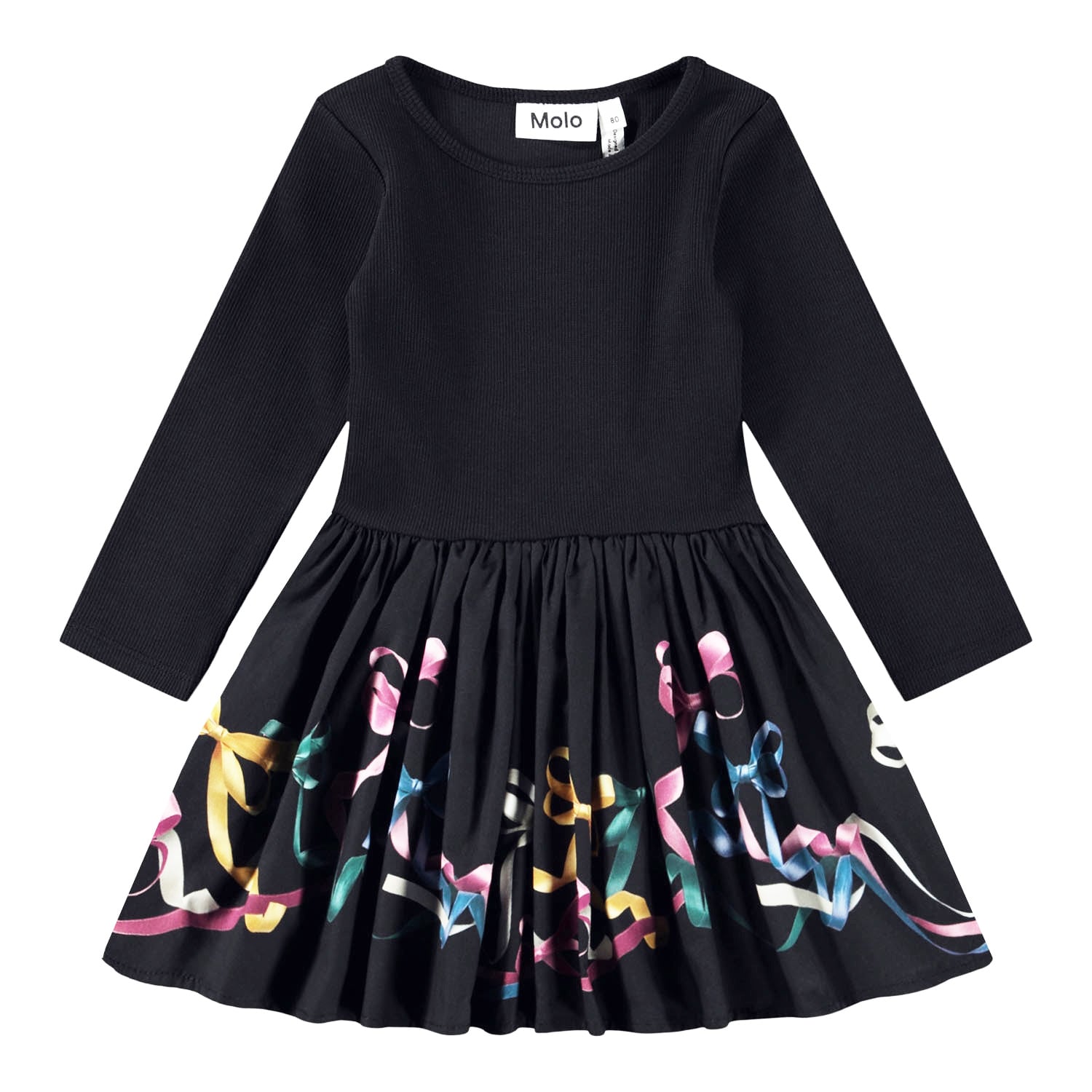 オーガニックコットン作られた長袖ワンピースです。黒地にカラフルなリボンの繊細なプリントが施されています。トップスはリブジャージー素材でスリムフィット、スカートはポプリン素材でボリューム感をプラス。きちんと見えながらも着やすく、快適な着用感です。<MOLO>の製品は、Ecocert GreenlifeのGOTSオーガニック認証を取得しています。