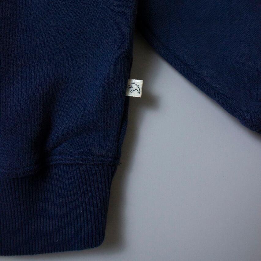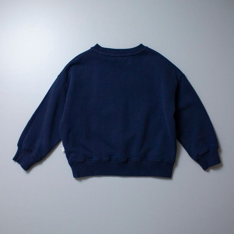 ブランドのシグネチャーでもあるワンポイントのスウェットプルオーバー。オーガニックコットンで作られたとてもソフトな生地です。ピーチスキンのような滑らかな肌触りの表面に、毛足が長く立体的なアップリケ、ネイビー×オレンジの配色も目を惹きます。肩幅を選ばず着心地の良いドロップショルダーにゆったりめのボディですが、袖口が細身にデザインされているため、すっきりと見えます。内側は起毛加工でさらに快適です。