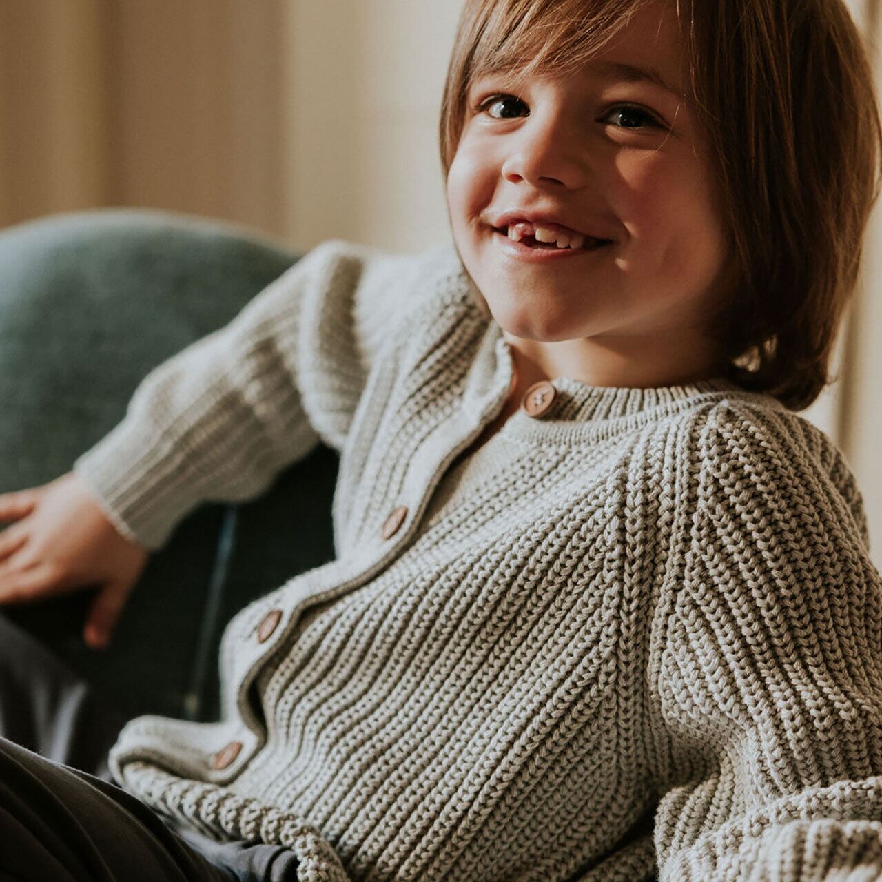 ユニセックスでご着用いただけ、肩幅を選ばず着心地の良いラグランスリーブのカーディガン。優しい雰囲気の木製のボタンと脇に施されたブランドのピスネームがさりげないポイントです。ミドルゲージのぷっくりとしボディは、100%オーガニックコットンとGotsおよびOekotex®認証の糸で作られています。肌触りの良いコットンニットは、長いシーズンで活用でき、チクチクが苦手なお子様にもおすすめです。