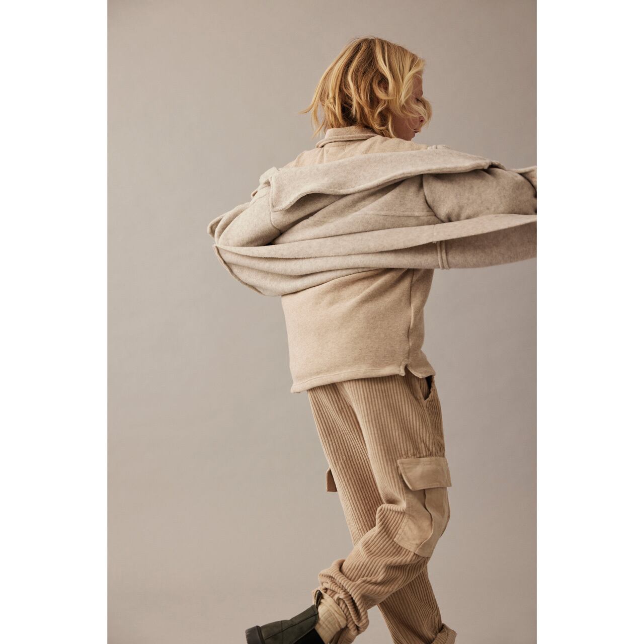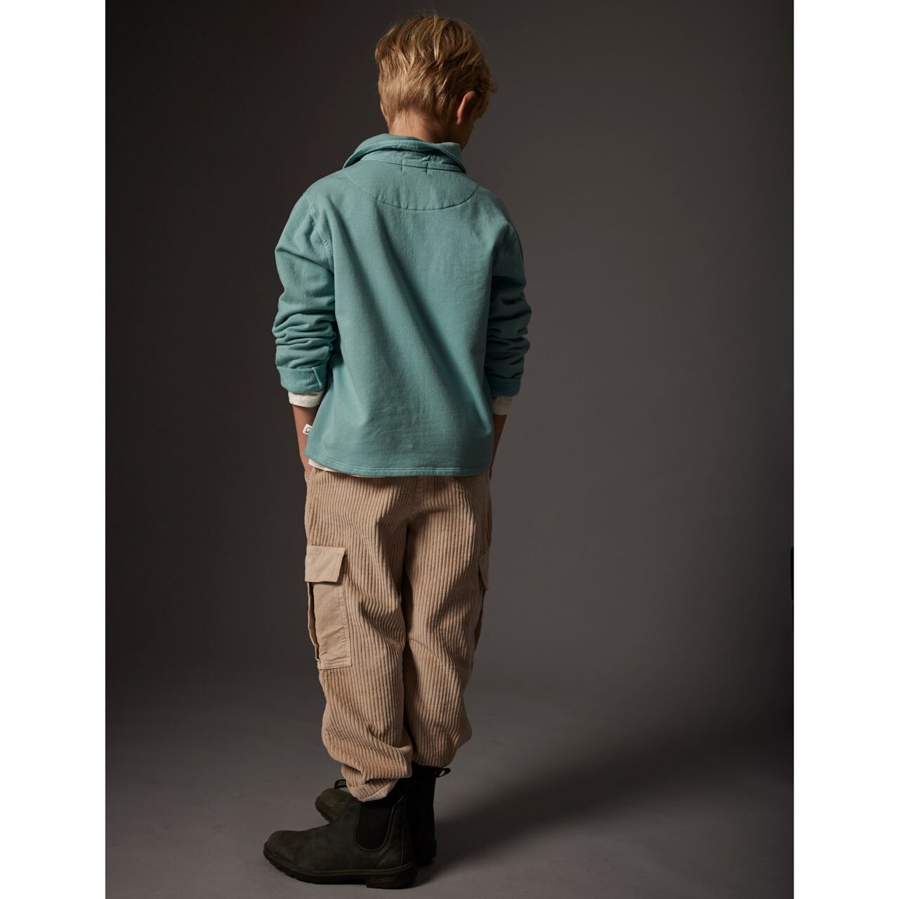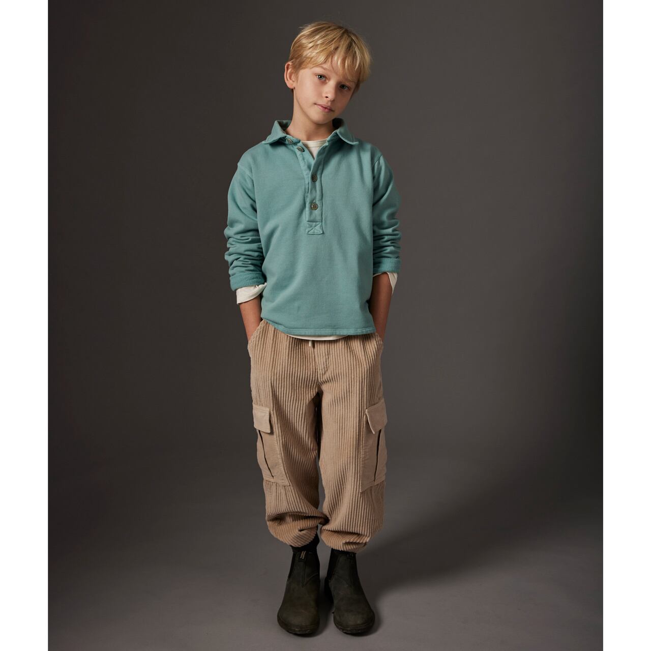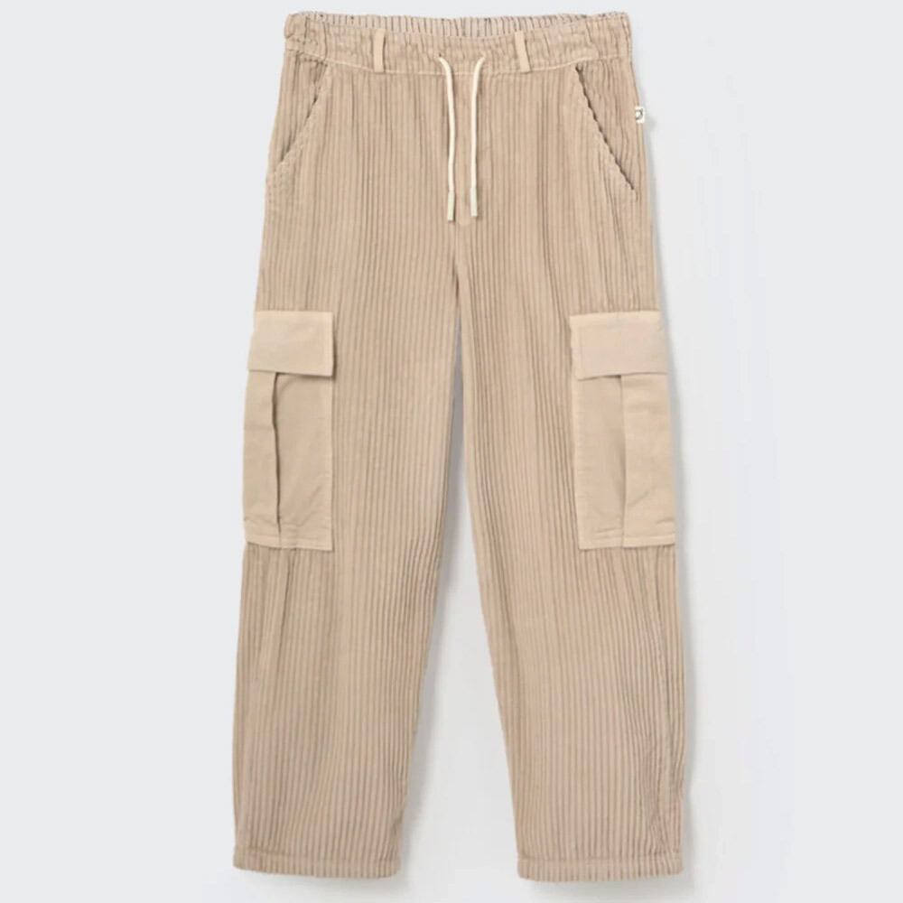 OCS認証とOEKO-TEX認証のオーガニックコットンを使用した、とても柔らかく着心地の良いワイドコーデュロイ カーゴパンツです。フープ付きの伸縮性のあるウエストバンドとドローストリング、サイドポケット、そして脚にはコントラストの効いたコーデュロイ素材のカーゴポケットが付いています。