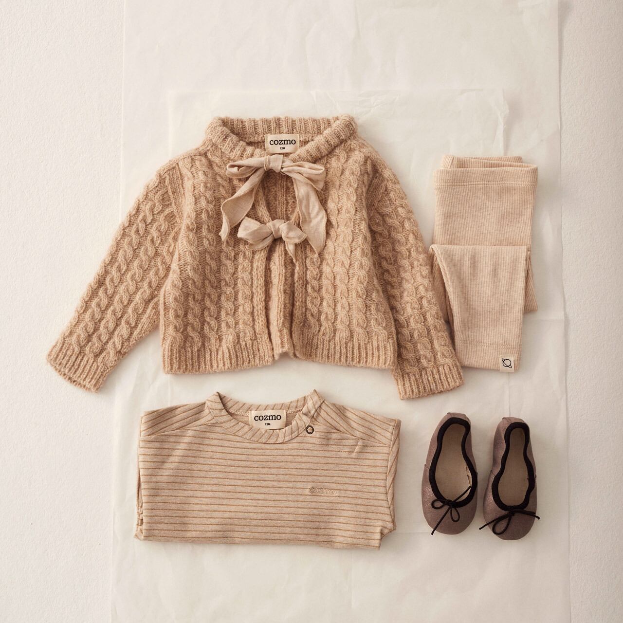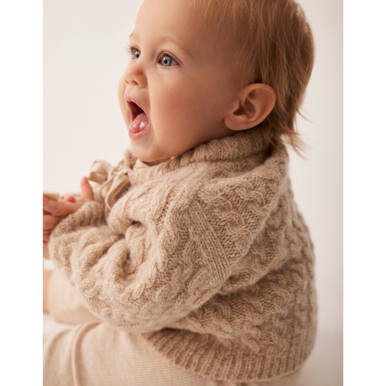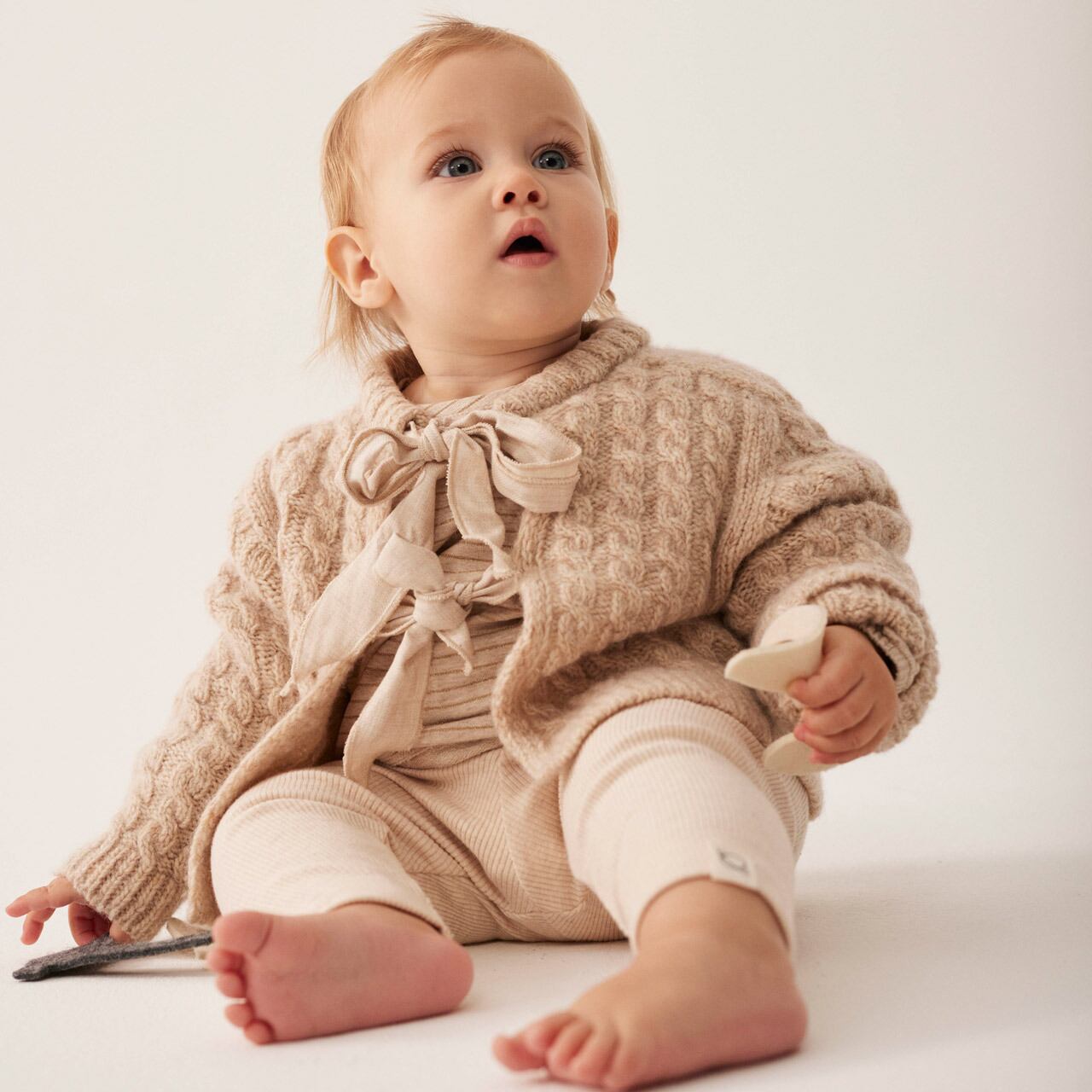 柔らかくふわふわとしたウールとリサイクルポリアミドを使用したベビーカーディガンです。ケーブル編みのトリコットが温もりある表情を演出し、ラウンドネックにリブ編みのネックライン・袖口・裾が、やさしく体にフィットします。フロントにはフランネル素材のリボンタイをあしらい、上品で愛らしいアクセントに。さりげない斑点模様が、洗練された柔らかな印象です。