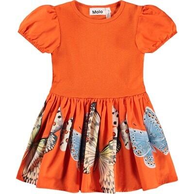やわらかなオーガニックコットンを使用し、スカート部分には今にも飛んでいきそうな蝶のプリントの華やかな一枚です。