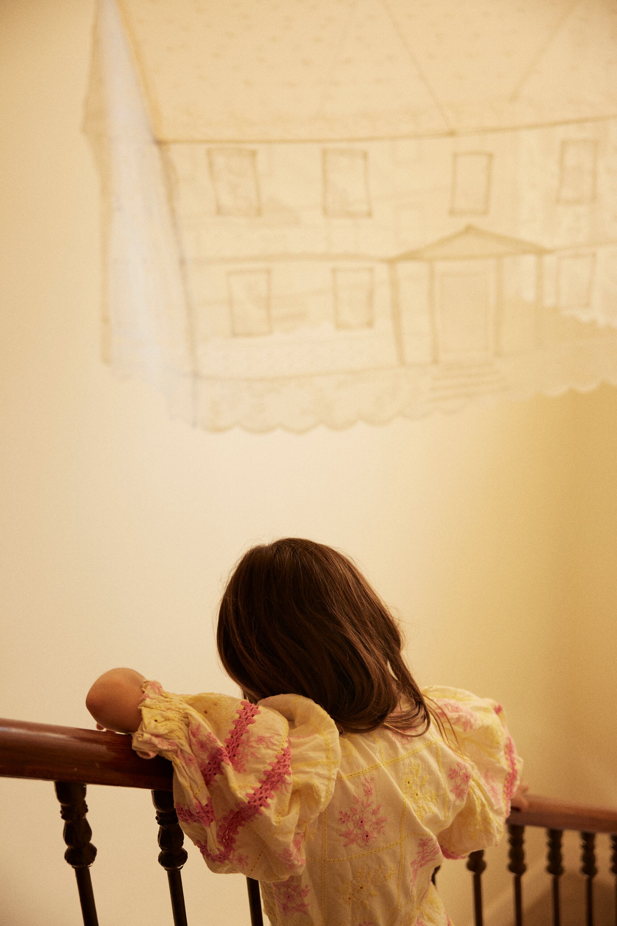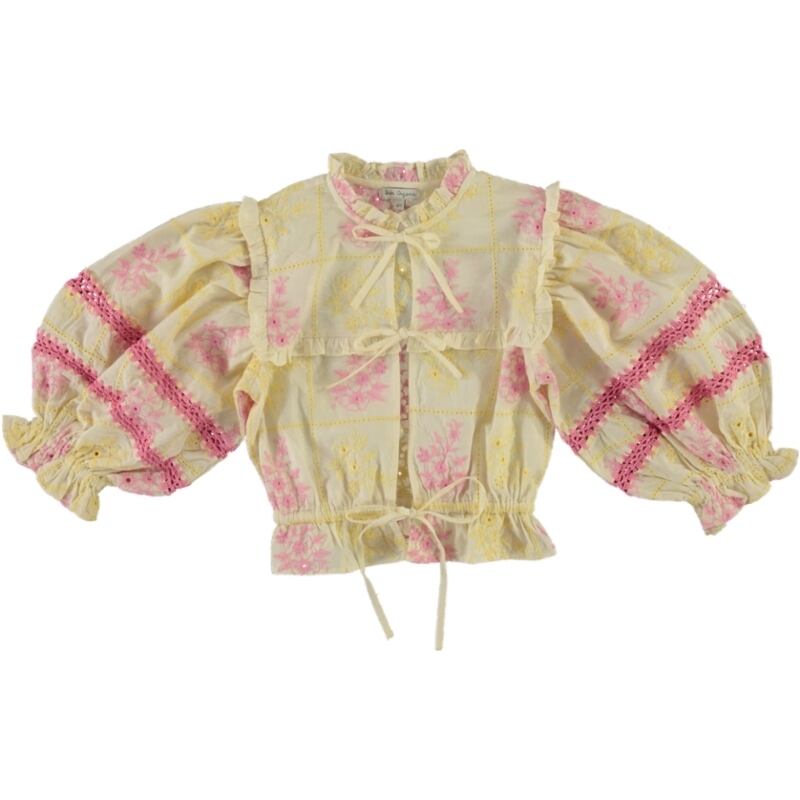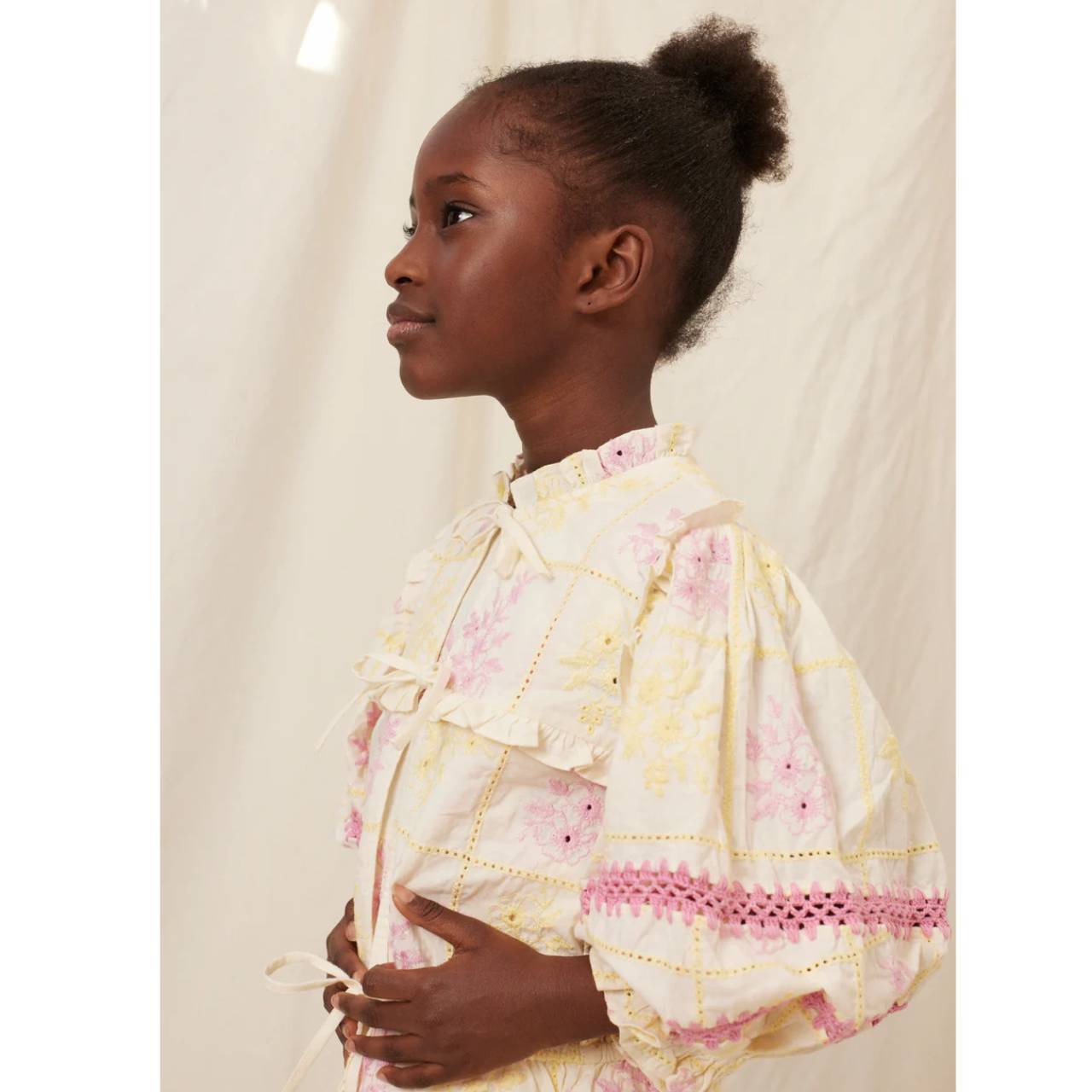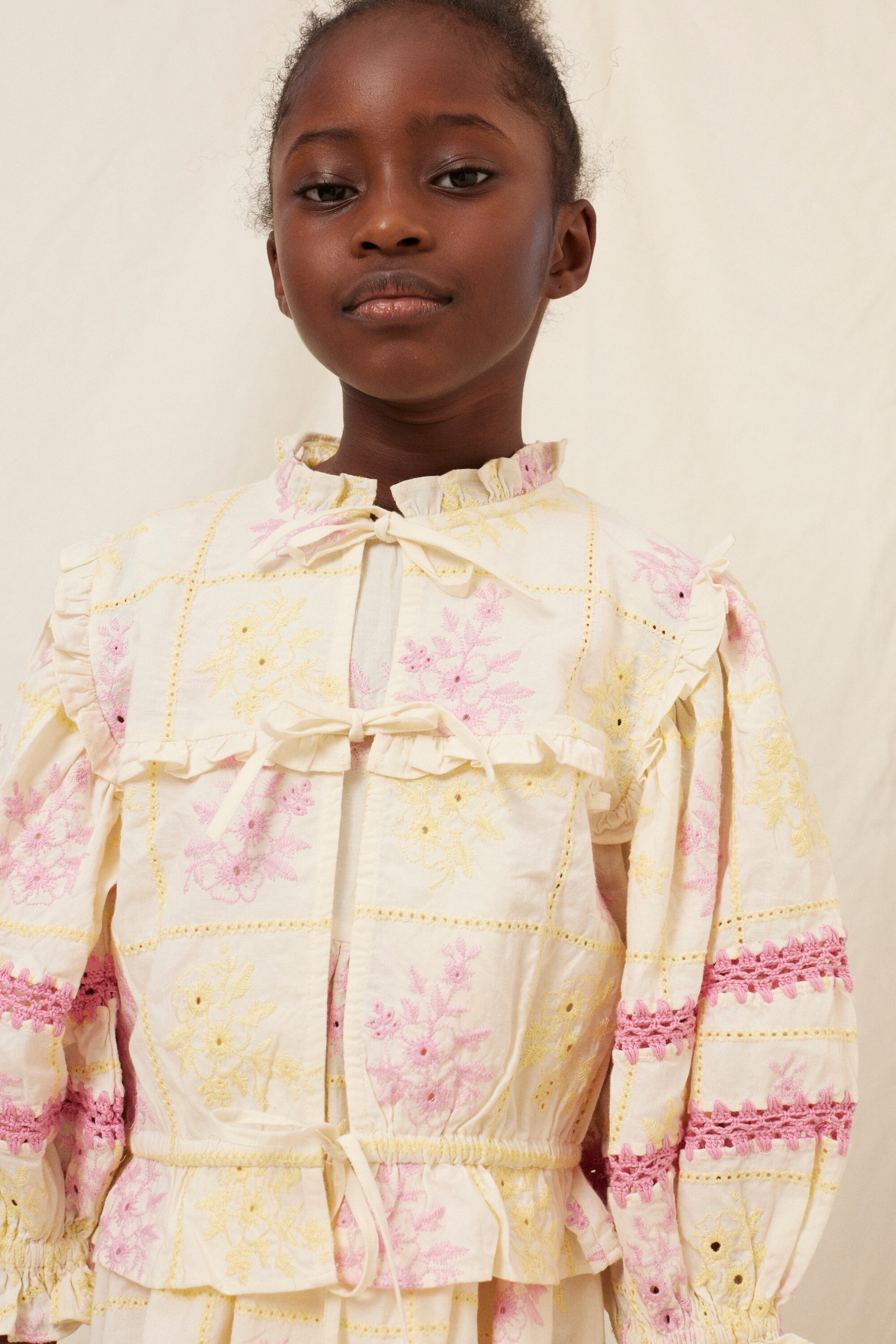ナチュラルホワイトのコットン素材に、ピンクとイエローの刺繍を施し、袖には手編みのクロシェディテールをあしらっています。