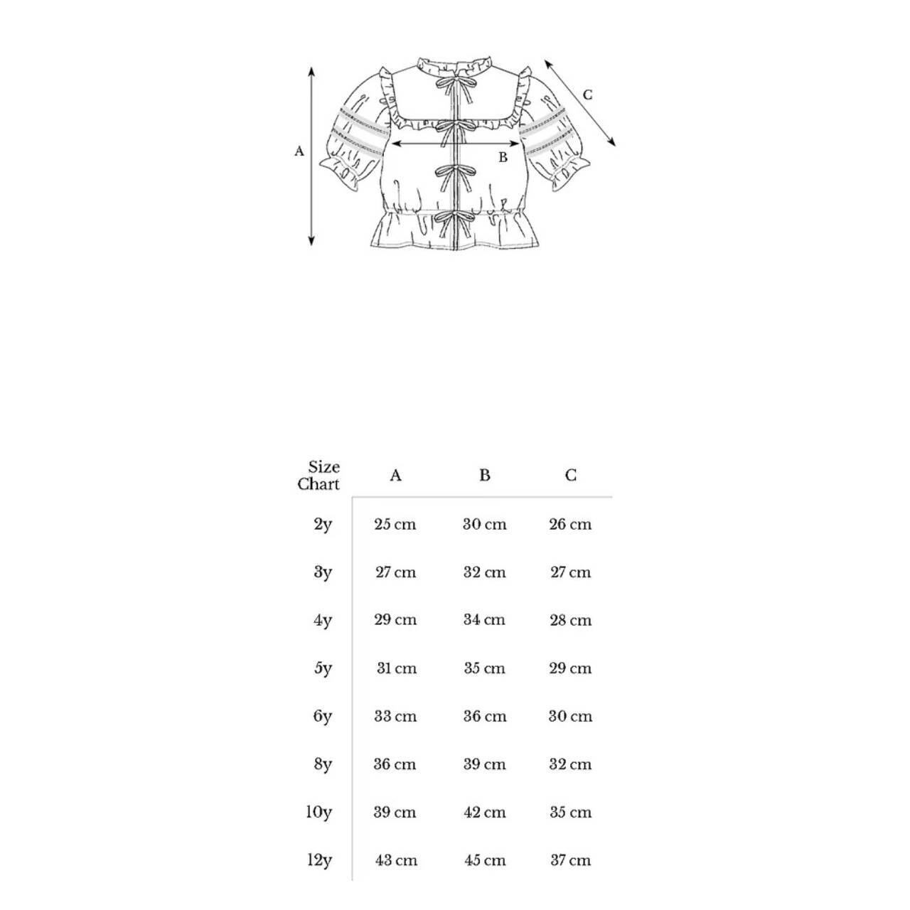 ボリュームのあるパフスリーブとフロントのタイクロージャー(フロントのリボン結び仕様。リボン結びができないお子様でも固結びできれば大丈夫です。)が特徴の愛らしく華やかなブラウスです。