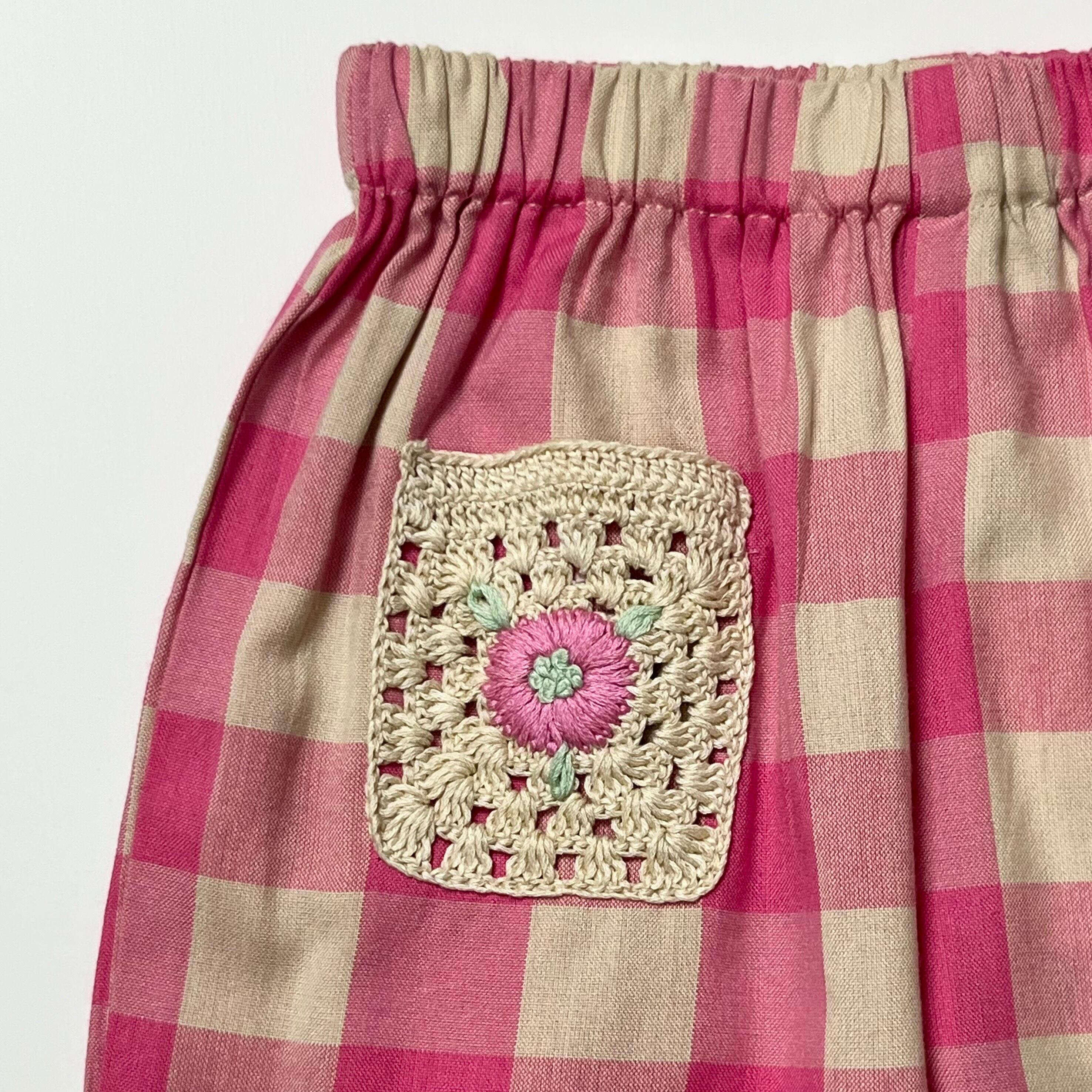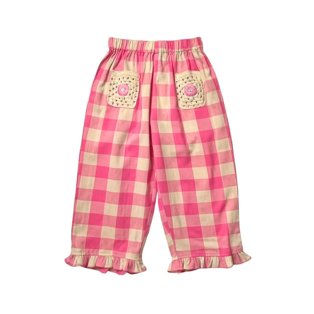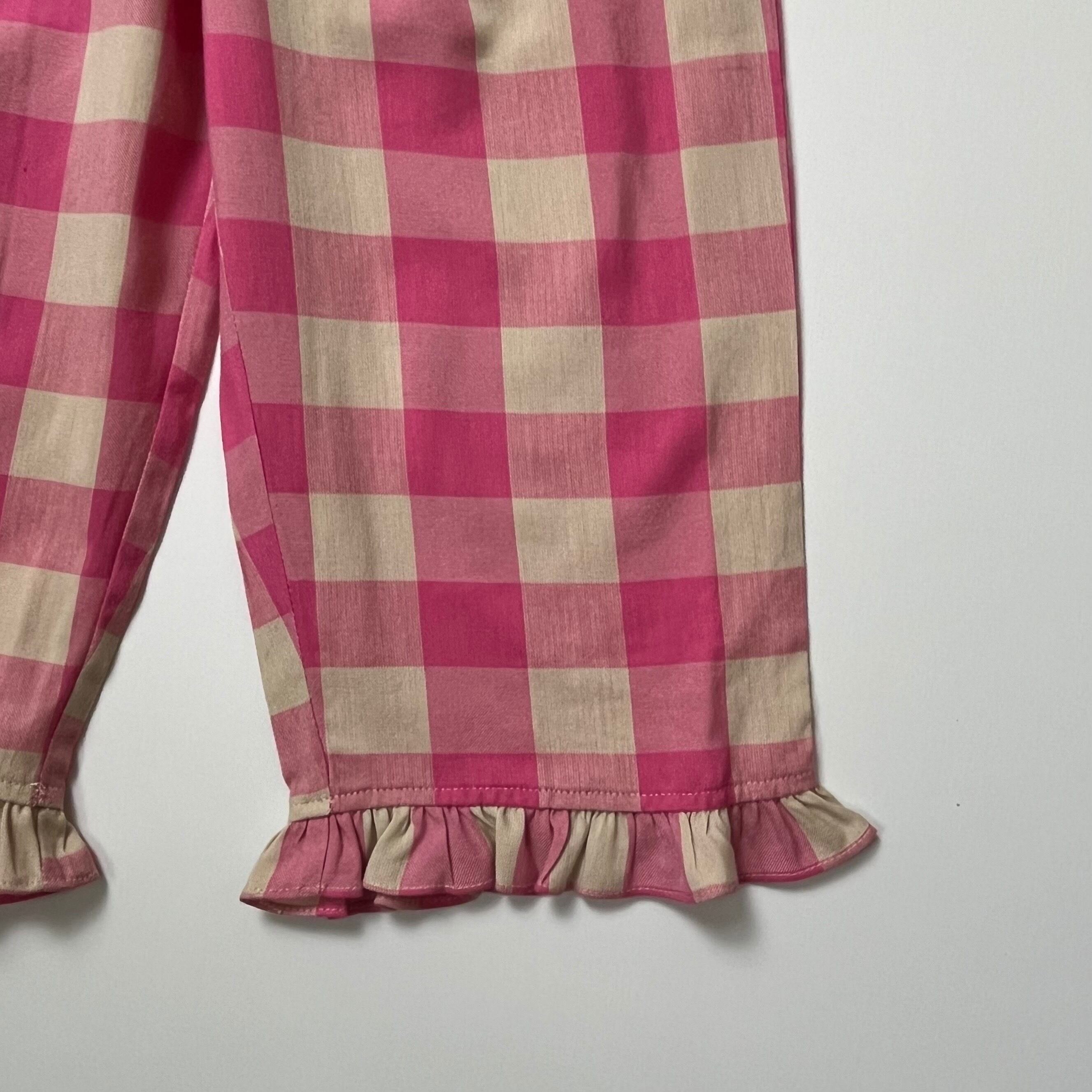 ピンクと生成りのブロックチェック柄に、裾フリルのトリミングを施したパンツです。