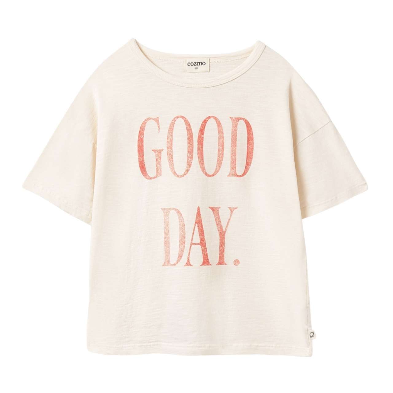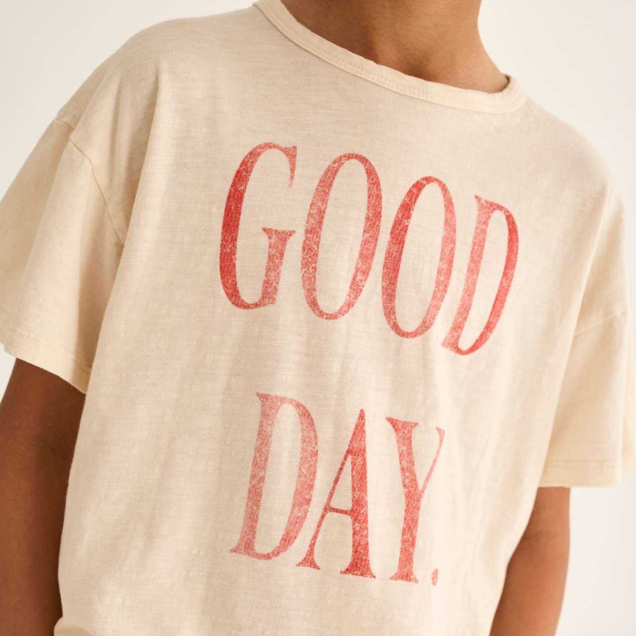 丸首、ドロップショルダー、半袖デザインで、「GOOD DAY」のヴィンテージ風プリント入りです。