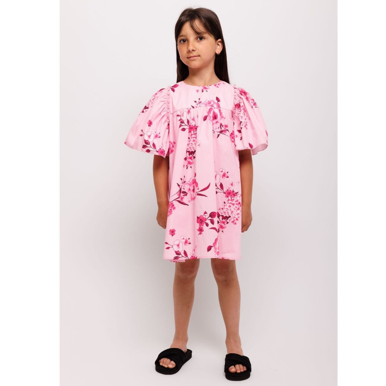 フレアに広がるボリュームスリーブと美しいピンクの花柄が目を引く、存在感のあるドレスです。