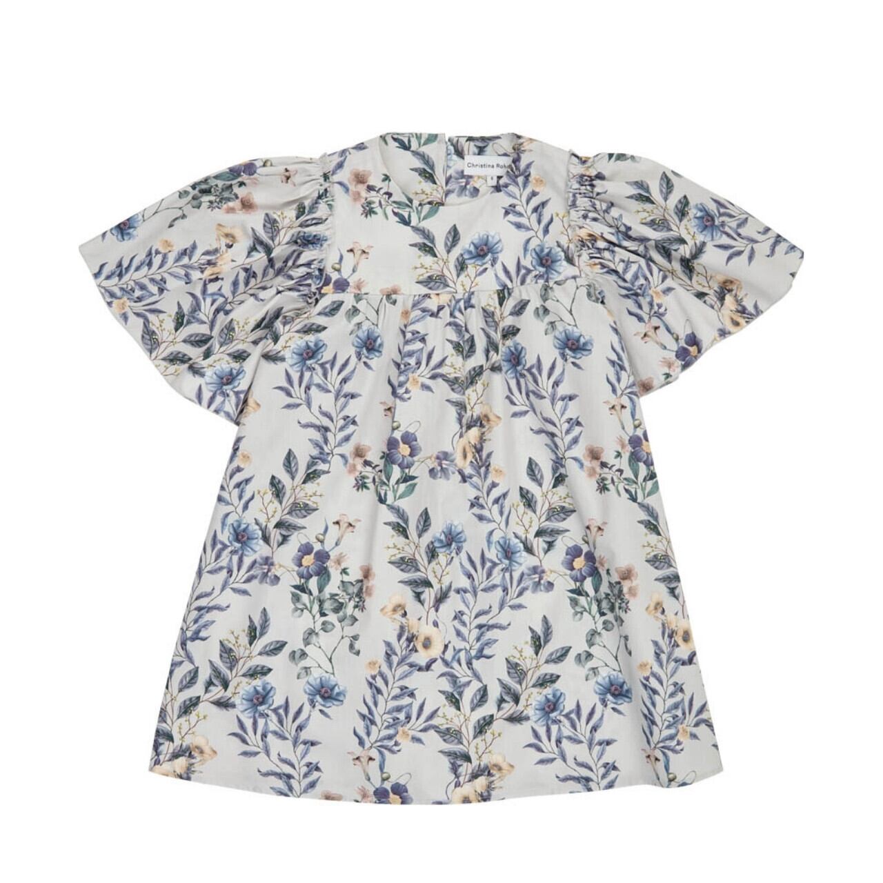 フレアに広がるボリュームスリーブとクラシックな花柄が目を引く、存在感のあるドレスです。